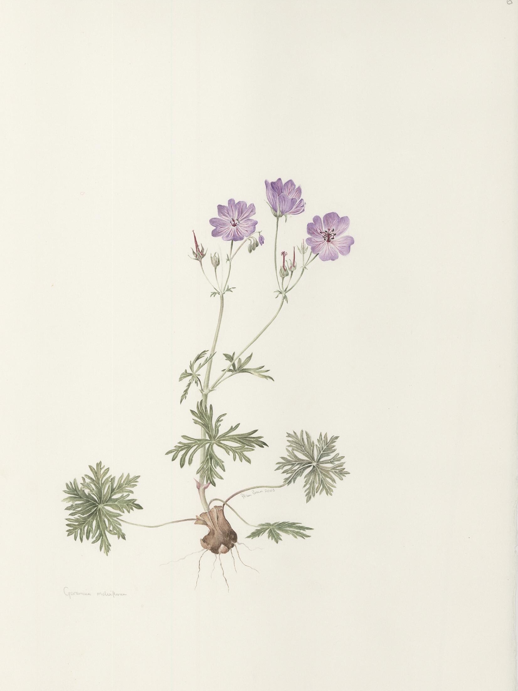 Peggy grew up in Wallington, Surrey. After the war she married Don Dawe, moving to Purley, Surrey, and they had two daughters – Sarah and Elizabeth. Comparatively late in life, Peggy followed her twin passions of botany and art by specialising in botanical painting. She won a gold artistic medal in one of the Alpine Garden Society shows, and her paintings were exhibited throughout Europe and regularly at the RHS shows in London, winning prestigious medals. Some of her paintings have also been published on greeting cards, and her line drawings illustrate The Gardener’s Guide to growing Hardy Geraniums (Bath & Jones 1994). She celebrated her 100th birthday in September 2024.